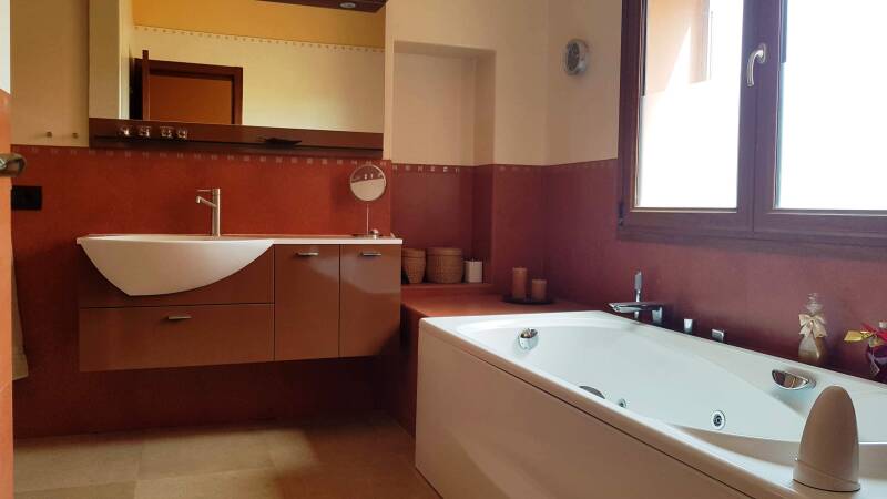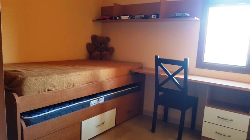 - Suite - 1 Schlafzimmer mit Doppelbett 160x200, Einzelbett 90x200, Deckenventilator mit Fernbedienung und Smart-TV. 1 Kinderzimmer mit Ausziehbett für 2 Betten in 90x190 mit einem Schreibtisch und einen großen offenen Kleiderschrank. 1 Badezimmer mit Waschbecken und Unterschrank. Kommode mit Hand-Duschtüchern. Bidet, WC, ebenerdige Dusche und Badewanne mit Whirlpool-Funktion.