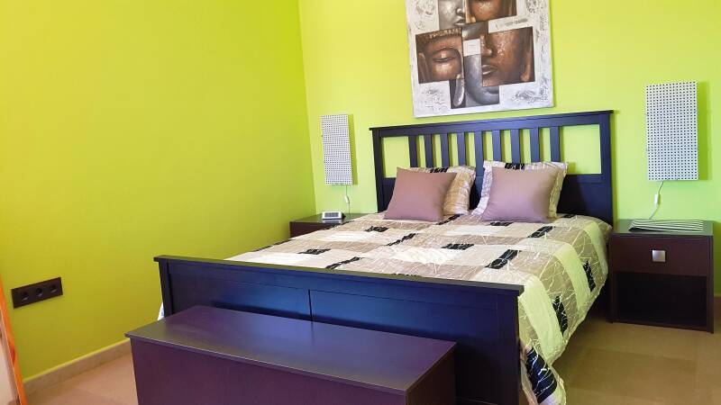 - Grüne Schlafzimmer - Doppelbett 160x200, Einbaukleiderschrank, Schreibtisch mit Stuhl, Deckenventilator mit Fernbedienung. Fenster mit Ausblick in den Garten und auf den Pool.