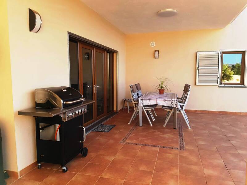 Eine große überdachte Terrasse lädt zum Grillen ein. Ein Vier-Flammen-Gasgrill sorgt für das perfekte Grillerlebnis.